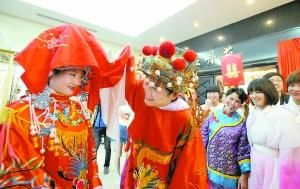媒婆在舊式婚禮中是一個重要角色,昨天,在婚禮現(xiàn)場,“媒婆”黃化碧說,自己的工作已經(jīng)接到10月份了,現(xiàn)在越來越多的人,特別是周邊一些區(qū)縣的,特別喜歡中式婚禮。