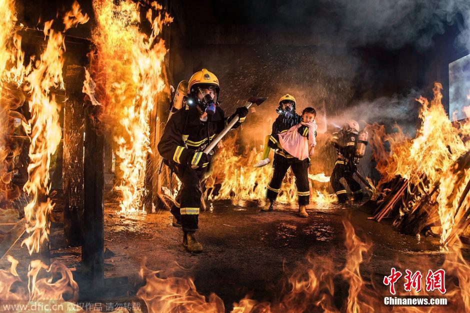 2014年11月6日,四川成都,“烈火中,他們展雄威,救人于危難,豪氣干云天”。當(dāng)晚10時,11·9消防日即將到來,四川省消防總隊與成都商報聯(lián)合推出 “烈火雄心”系列海報式視覺大片,以情景再現(xiàn)的專業(yè)攝影手段,刻畫出消防官兵一個個真實(shí)的工作畫卷。整個系列海報由9幅照片組成,涵蓋了車禍救援、火場突圍、高樓救人等多個救援場景,海報中男消防員威武豪氣,女消防員英姿颯爽?!霸?19宣傳日,是想以一種更加直觀、形象的方式,還原消防員真實(shí)的生活工作狀態(tài)?!睋?jù)這組大片的主創(chuàng)人員介紹,這次的組圖拍攝,類型包括地震廢墟、車禍困人、高樓營救等各類場景,將更全面的向世人展示不同類型的消防員,以及他們在救援現(xiàn)場背后的感人瞬間,從各個層面展現(xiàn)出消防官兵他們奮不顧身、舍生忘死、一心為民的英雄本色。本組圖片中的角色,都是實(shí)實(shí)在在的消防員。每張海報的背后,都有著類似的救援故事,讓這些看似熟悉的場景,用海報大片的形式呈現(xiàn)給大家,將事實(shí)再現(xiàn)。圖片署名:成都商報-東方IC