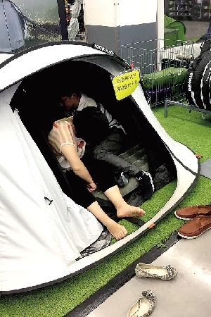 除此之外,戶外用品區(qū)也成為最受歡迎的展品區(qū)。因為這里擺放的大量戶外用品,如帳篷、充氣床、釣魚折疊椅等,都能供客人休息,很多一家三口在此休息。