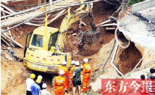 塌方發(fā)生時(shí),一男一女被民警和熱心市民救出。目擊者稱,坑中仍有一名女士和小孩,但警方經(jīng)過(guò)排查,除了名叫張帆的女士,尚未發(fā)現(xiàn)有人員失蹤。今報(bào)三批記者輪班蹲守現(xiàn)場(chǎng),截至3日2時(shí),救援在經(jīng)歷了近30個(gè)小時(shí)后,尚未找到張帆?!鯑|方今報(bào)記者 夏萍 見習(xí)記者 靳亞?wèn)| 宋迎迎 攝影 首席記者 袁曉強(qiáng) 張曉冬 沈翔 邱琦