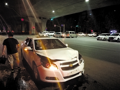 當日凌晨1時10分,記者現(xiàn)場看到,南三環(huán)南半幅下橋口處,由西向東約30米的路面上布滿車身碎片,一輛白色雪佛蘭轎車??吭谧钣覀?cè)快車道上,車前臉已凸起,主副駕駛室的安全氣囊均已彈出,車輛仍處于啟動狀態(tài)。