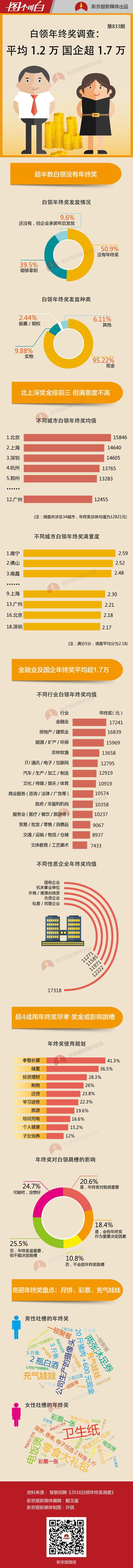 春節(jié)將至,“年終獎”又成了眾人關注的話題。近日,智聯(lián)招聘發(fā)布《2016白領年終獎調(diào)查》,調(diào)查通過對11526份有效問卷分析顯示,涉及的34城市年終獎總體均值為12821元。其中,北京最高,為15846元,上海和深圳次之。不過,三個城市的白領對年終獎的滿意度并不是很高。
