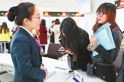 4月1日,中國(河南)自由貿易試驗區(qū)鄭州片區(qū)綜合服務中心內,工商預審柜臺正在接受客戶咨詢。⑨7本報記者聶冬晗攝