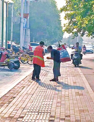 發(fā)生在鄭州金水路街頭的這一幕,剛好被市民拍到。昨日在網(wǎng)絡(luò)上發(fā)布后,感動了很多網(wǎng)友。62歲的女環(huán)衛(wèi)工事后說:“這是應(yīng)該的,是小事,不值得宣傳?!备浇熳R她的人說,這名環(huán)衛(wèi)工是個熱心腸,之前已經(jīng)多次給流浪人員買飯、送水、送餐。