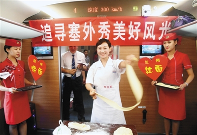為了慶祝首發(fā),李惠萍帶領幾名高姐,策劃了各種小環(huán)節(jié)來和旅客互動,現(xiàn)場做燴面、拉牛肉面,整個車廂熱熱鬧鬧。