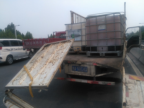 8月27日下午,一輛滿載大醬油桶的貨車,在鄭州市西三環(huán)與中原路交叉口南側(cè)違規(guī)上橋時(shí),因車體超高撞上橋口限高桿,車上的13個(gè)方形醬油桶滾落在路中間,嚴(yán)重阻塞了交通。