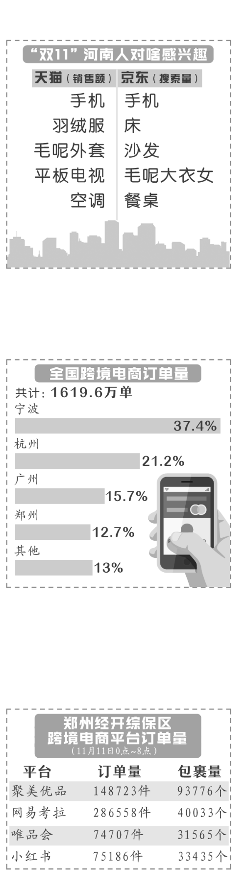 今年“雙11”期間,全國各跨境電子商務試點城市紛紛交出亮麗答卷,海關總署統計數據顯示,僅“雙11”單日,全國跨境單量共計1619.6萬單,寧波占比37.4%,杭州占比21.2%,廣州占比15.7%,鄭州占比12.7%。