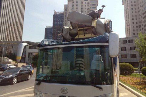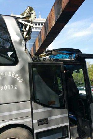 北京大巴車(chē)撞上限高桿 車(chē)頂凹陷無(wú)傷亡