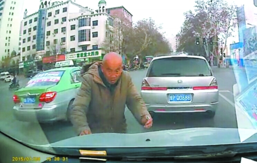 1月8日下午,鄭州市解放路立交橋西向東下橋口處,趙先生正停車待轉(zhuǎn),看到一名身穿灰色棉襖的老人正向前方豫P牌照的本田商務(wù)車討錢。