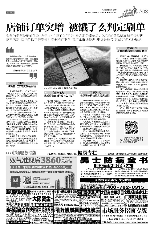 4月16日,《河南商報》以《店鋪訂單突增 被餓了么判定刷單》為題,對老劉10萬多元的交易款被凍結一事進行報道,“餓了么”市場經(jīng)理潘先生稱,因為連續(xù)多天多個手機號在老劉店鋪下單,系統(tǒng)判斷為商家刷單,套取“餓了么”給用戶的補貼,所以將老劉的賬戶貨款凍結了。