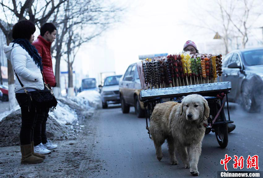 2月6日,在長春市一條繁華的街路上,一只小狗幫助身殘主人拉車賣冰糖葫蘆,成為長春冬日街頭一道感人的風(fēng)景線。據(jù)主人介紹,雖然自己身殘且貧窮,但并不想靠別人救濟度日,因此學(xué)會了制作冰糖葫蘆的手藝,并以此自食其力。而他養(yǎng)的這條小狗“大黃”也是對主人不離不棄,每日都會幫助主人拉車外出謀生。圖為小狗拉著主人的糖葫蘆車走在繁華的街道上。張瑤 攝
