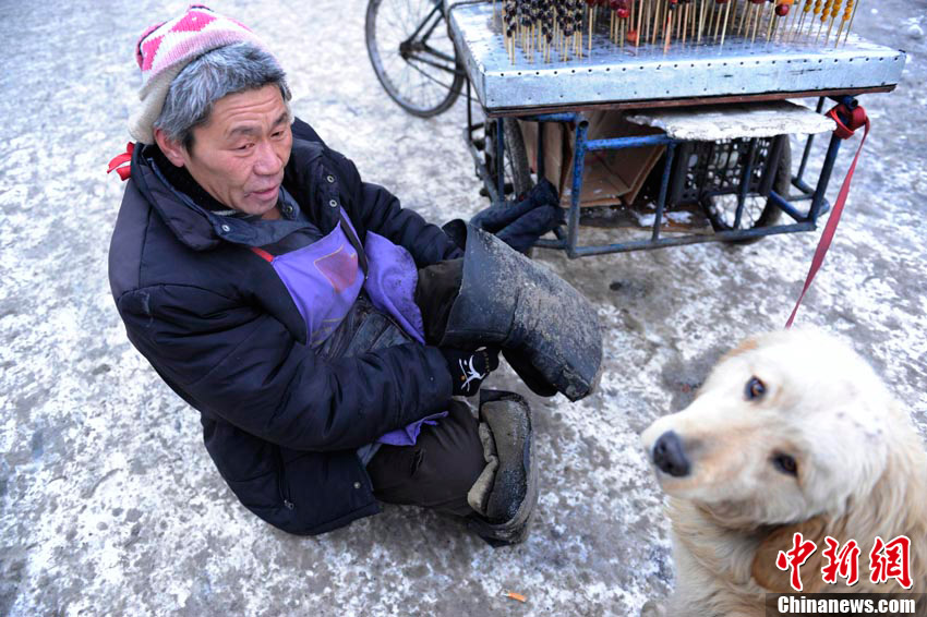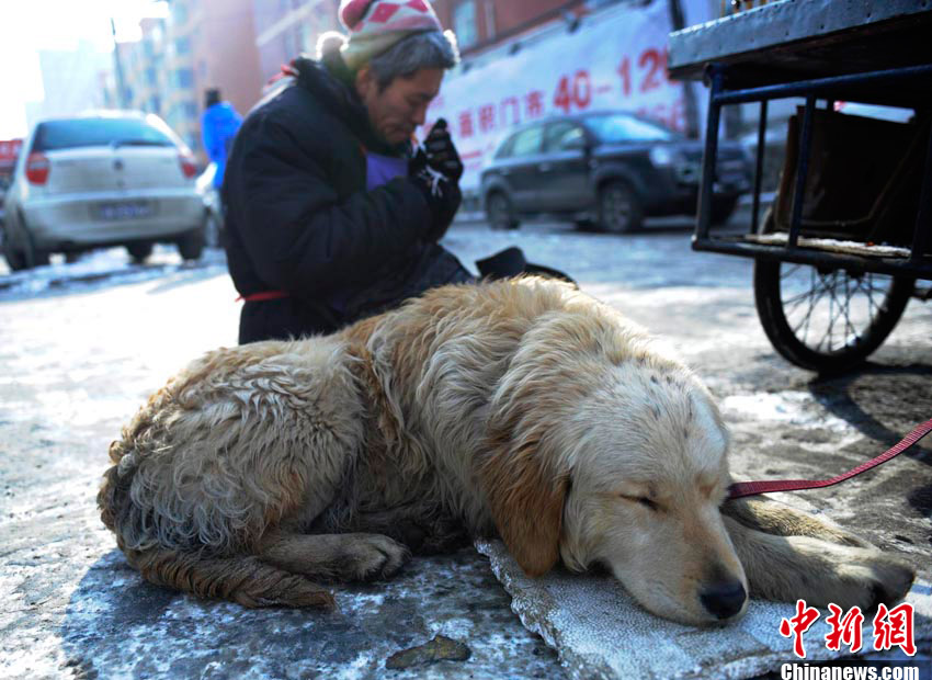 2月6日,在長春市一條繁華的街路上,一只小狗幫助身殘主人拉車賣冰糖葫蘆,成為長春冬日街頭一道感人的風(fēng)景線。據(jù)主人介紹,雖然自己身殘且貧窮,但并不想靠別人救濟度日,因此學(xué)會了制作冰糖葫蘆的手藝,并以此自食其力。而他養(yǎng)的這條小狗“大黃”也是對主人不離不棄,每日都會幫助主人拉車外出謀生。圖為主人在賣冰糖葫蘆時,小狗乖乖的守在車旁。張瑤 攝