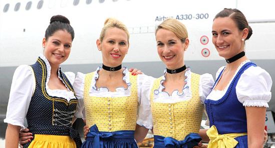 漢莎公司空姐2005年改穿這種巴伐利亞傳統(tǒng)制服,當(dāng)時(shí)恰逢每年一度的慕尼黑啤酒節(jié)。2014年,漢莎公司從慕尼黑前往北京、圣保羅以及墨西哥城的長(zhǎng)途航班上,乘務(wù)員都穿起傳統(tǒng)服裝??战愦S色緊身衣,上面印有藍(lán)花,配上藍(lán)白相間的裙子。