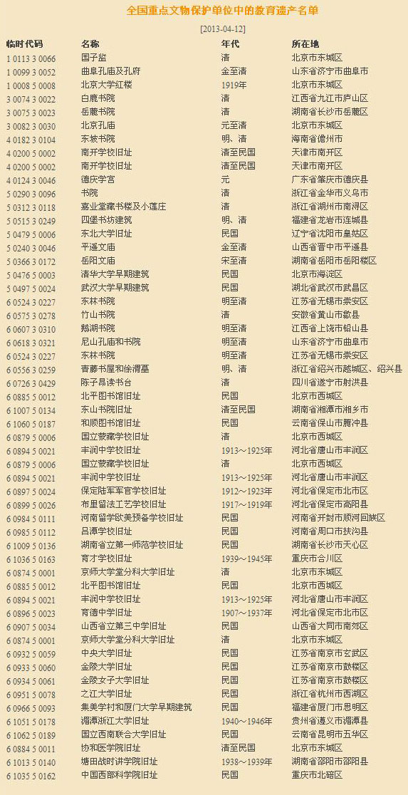 我國作為歷史悠久的文明古國,教育的傳統(tǒng)源遠流長,春秋私學即興;此后官學、私學交織發(fā)展,在歷史上形成“學校如林、庠序盈門”的景象,給后世留下了極為豐富的教育遺產(chǎn)。僅在國務院批準的全國重點文物保護單位當中,就有 “國子監(jiān)”“孔廟”“白鹿書院”“岳麓書院”“北京大學紅樓”等相關教育遺產(chǎn)六十余處。它們不僅具有文物建筑本身的歷史、科學、美術、文化等各方面的價值,而且承載、見證了中華民族優(yōu)秀的文化教育傳統(tǒng),促進了各個時代的精神文化建設。因此,提出并深入研究教育的遺產(chǎn),不僅有利于豐富歷史文化遺產(chǎn)的內容,而且有利于進一步細分文化遺產(chǎn)類型、豐富世界文化遺產(chǎn)的多樣性。