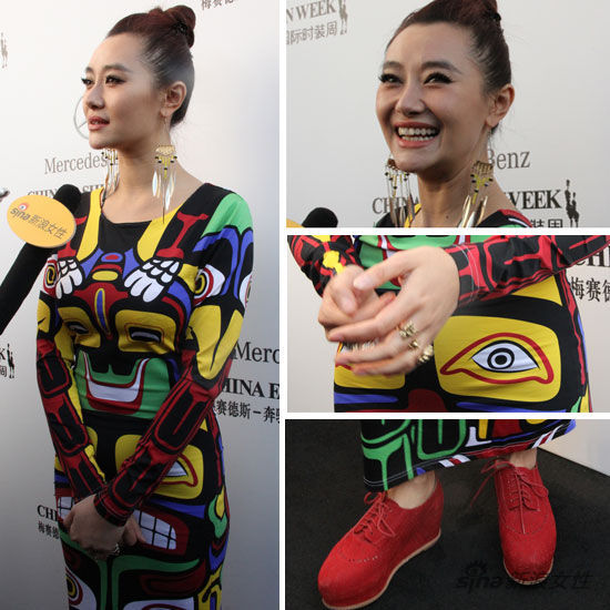 中國國際時裝周啟動儀式,愛戴一襲民族風緊身長裙秀纖細小蠻腰,搭配了大紅色的休閑鞋,梳起了俏皮的丸子頭,在配上流蘇項鏈和金屬朋克風的戒指首飾,整身表達了周末輕松愉悅的心情,同時花花綠綠的出街,又很吸引人眼球。