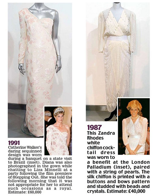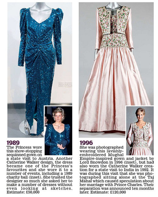 左:Catherine Walker深海綠色亮片禮服。1989年戴安娜王妃穿著該禮服在奧地利進(jìn)行國事訪問。估價(jià):5萬英鎊