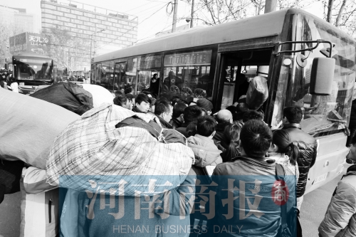 河南商報(bào)記者 鄧萬(wàn)里/攝 不少返城農(nóng)民工下了長(zhǎng)途車(chē)來(lái)擠公交車(chē)