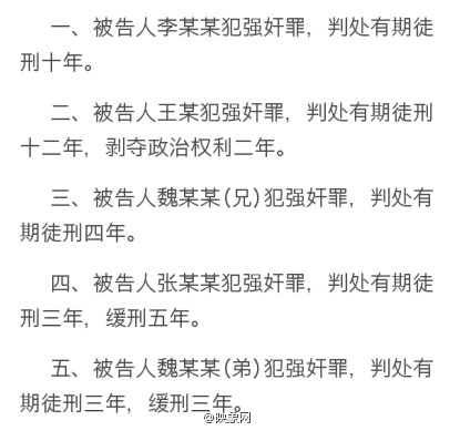 映象網(wǎng)訊 9月26日上午,北京法院網(wǎng)官方微博@京法網(wǎng)事 消息:李某某等5人強(qiáng)奸案一審宣判,其中,被告人李某某犯強(qiáng)奸罪,被判處有期徒刑10年。