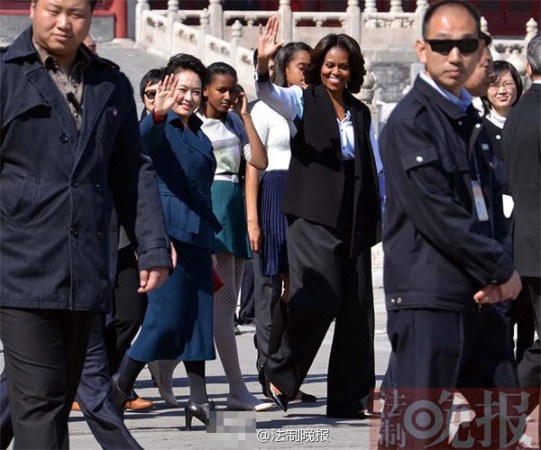 3月21日上午,美國總統(tǒng)夫人米歇爾參觀故宮,彭麗媛陪同。彭麗媛一身湖藍(lán)色裙裝,米歇爾黑白色職業(yè)裝扮,兩個女兒穿著清爽的休閑裙裝。