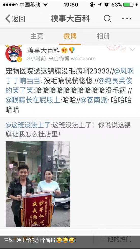 “狗狗三妹是今年4月份送到這里醫(yī)治的,8月7日送來了錦旗,和我們醫(yī)護(hù)人員合影。沒想到最近突然在微博火了,一覺醒來,很多客戶叫我網(wǎng)紅。”振明寵物醫(yī)院院子孫振明說,有人贊揚(yáng)勇氣,有人嘲笑謾罵,但如果你要是知道事情的始末,你就不會(huì)覺得可笑?這是一個(gè)關(guān)于愛、守護(hù)和堅(jiān)持的故事。