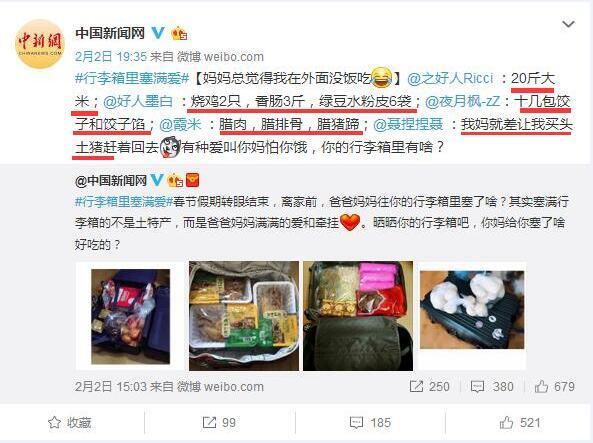 年,就這么過完了……@中國新聞網(wǎng)在微博上發(fā)起了一個過年返程催淚話題#行李箱里塞滿愛#,離家前,爸爸媽媽往你行李箱里都塞了啥?看了網(wǎng)友的回復,有饅頭、大米、土雞蛋、餃子餡、燒雞……簡直笑到飆淚。其實,塞滿行李箱的不是土特產(chǎn)、不是洋氣貨,是愛、是滿滿的牽掛與不舍!