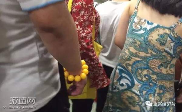 ▲7月16日,地鐵一號線,一名中年禿頂、戴著黃色手鏈的男子不時碰觸前面女士的臀部。 新京報記者 大路 攝