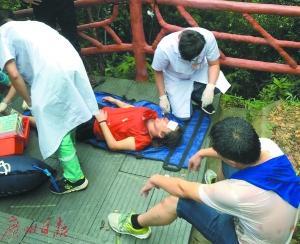 醫(yī)護(hù)人員在半山處對傷者進(jìn)行救治。廣州日報 圖