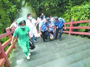 盧先生繼續(xù)攙扶著妻子往山下走。當(dāng)他們走到離山腳還有900米時,遇到了兩名前來施救的輔警,兩人在兩名輔警的攙扶下,繼續(xù)慢慢向山下走去。走到離山腳約600米距離時,120急救人員、景區(qū)工作人員及兩名輔警也趕來了。醫(yī)護(hù)人員對他們進(jìn)行了檢查和包扎后把王女士抬上擔(dān)架。王女士一邊輸液一邊被抬下山。40分鐘后,終于到達(dá)山下,王女士被送往醫(yī)院救治。