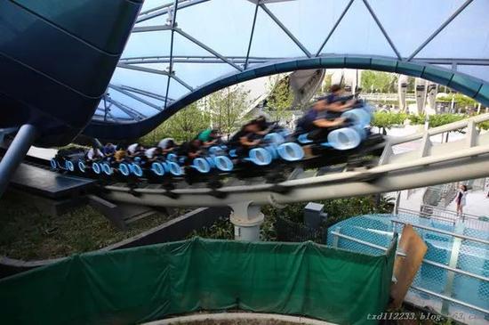 記者一行跟隨導覽員先來到了“極速光輪”區(qū),這是一個非常受游客追捧的項目,有些類似過山車,但視覺、聽覺和感官的沖擊力遠比過山車強烈。雖然時間還早,但進口處已經(jīng)排著長長的隊,提示等候時間為2小時40分鐘。