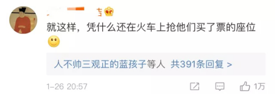 這位網(wǎng)友說:“就這樣,憑什么還在火車上搶他們買了票的座位?”