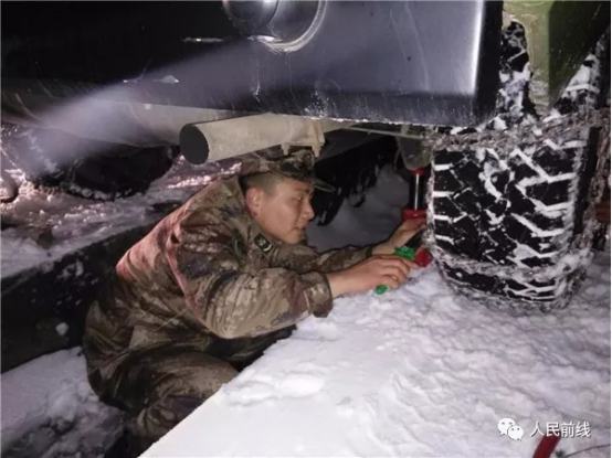 ▲第71集團軍某合成旅迅速啟動應(yīng)急方案,檢查并禁錮車輛防滑鏈。