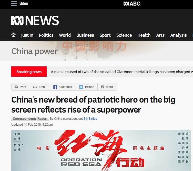 澳大利亞廣播公司新聞網(wǎng)分析稱,中國(guó)大銀幕上的新型愛(ài)國(guó)英雄反映了一個(gè)超級(jí)大國(guó)的崛起。作為中國(guó)強(qiáng)大外交自信在電影領(lǐng)域的展現(xiàn),銀幕英雄將會(huì)越來(lái)越多的揮舞著中國(guó)旗幟。