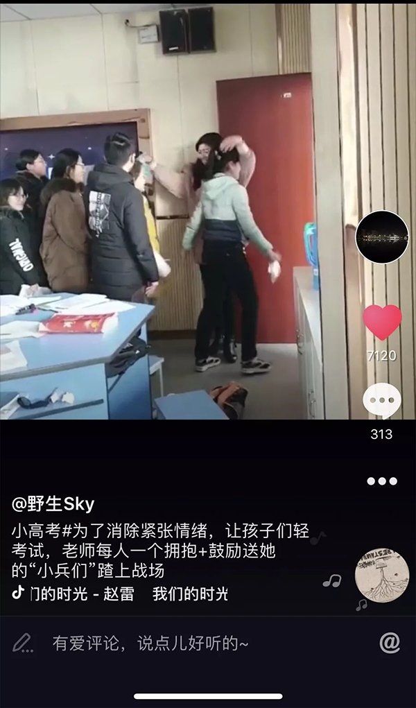 胡梅從教已經八年。據其介紹,考前利用各種方式給學生減壓,在白蒲高中早已是常態(tài)。“除了排隊挨個擁抱,還有老師會送巧克力啊之類的”,胡梅說。