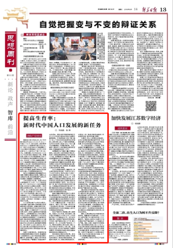 8月14日,江蘇省委機(jī)關(guān)報(bào)《新華日報(bào)》在第13版“思想周刊·智庫”欄目刊發(fā)了劉志彪、張曄聯(lián)合撰寫的題為《提高生育率:新時(shí)代中國人口發(fā)展的新任務(wù)》的署名文章。