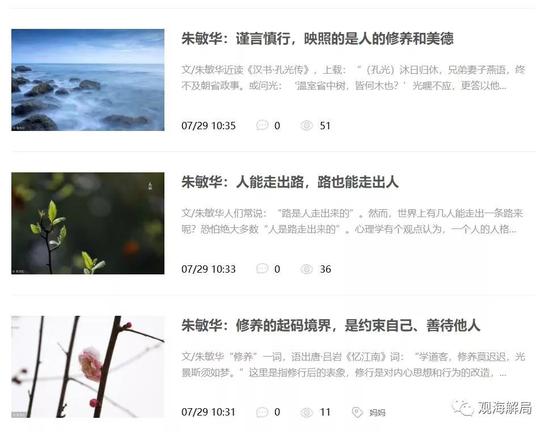 這些文章以游記、散文、人生感悟?yàn)橹?,也有一部分?shī)歌。其中,最新的一篇為《聞過(guò)則喜 折射的是胸襟格局和修養(yǎng)境界》,發(fā)表于8月13日,也就是本周一。