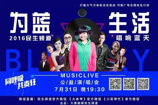 同呼吸,共責(zé)任,打贏大氣污染防治攻堅(jiān)戰(zhàn),河南廣電全媒體在行動(dòng),為藍(lán)生活唱響藍(lán)天,2016民生頻道MUSIC LIVE公益演唱會(huì)7月31日晚19:30,喚醒你的雙耳,等你來(lái)聽……