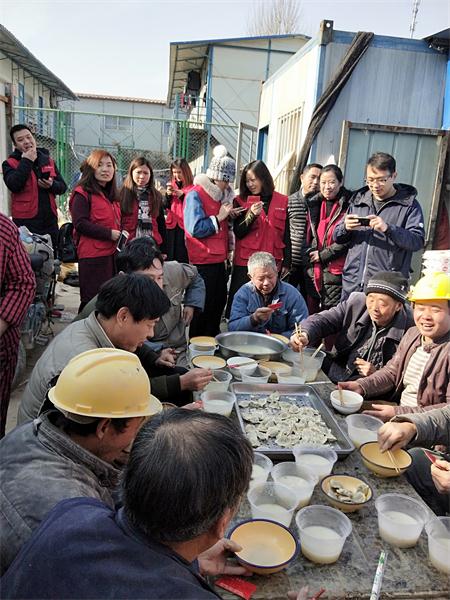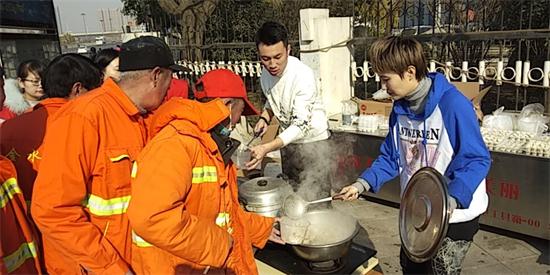 另一邊,在鄭州市花園路廣電南路交叉口,主持人劉雯和韓佳帶著十幾名義工早早的在路邊就開始忙活了。他們要給附近50多名環(huán)衛(wèi)工人煮餃子。平時(shí),環(huán)衛(wèi)工們的午飯都很簡單,甚至都是隨便對付的,這次,主持人和義工們特意選在離工人們中午休息比較近的地方,搭起了臨時(shí)的灶臺,給工人們做上一頓熱騰騰的餃子。由于條件簡陋,臨時(shí)灶臺上的火十分不穩(wěn)定,劉雯和韓佳脫下厚重的外套,擼起袖子親自生火,費(fèi)了好大勁終于把餃子下鍋了。吃上熱騰騰的餃子,環(huán)衛(wèi)工人們特別開心。一位老大爺由衷的感嘆道:“好久沒吃過這么暖心的午飯了,謝謝你們。”