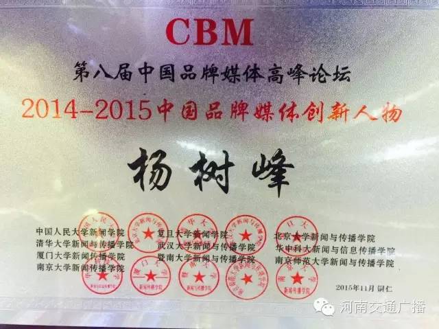 本屆論壇上,河南交通廣播總監(jiān)楊樹峰榮獲2014-2015中國品牌媒體創(chuàng)新人物稱號(hào),這是對(duì)他個(gè)人成就的肯定,更體現(xiàn)了河南交通廣播運(yùn)管機(jī)制的成功,人文關(guān)懷、扁平化管理,民主決策、智慧碰撞,從決策層發(fā)出的指令,成為掌控河南交通廣播精準(zhǔn)運(yùn)行,走向成功的靈魂,而我們一切的努力,都是為了實(shí)現(xiàn)一個(gè)目標(biāo):無論何時(shí)、何地,無論現(xiàn)在、未來,伴你出行每一刻。