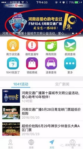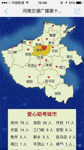 高考期間,河南交通廣播倡導(dǎo)全省車友綠色出行、在交廣領(lǐng)航上用愛(ài)心點(diǎn)亮河南地圖;
