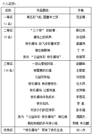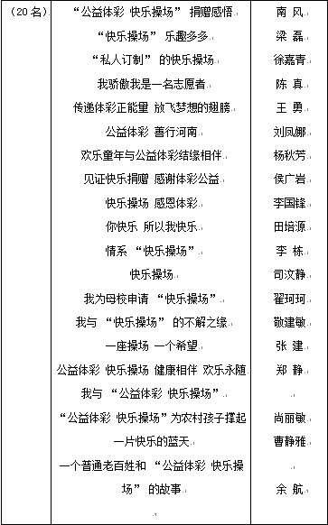 經(jīng)過一個多月的征文和評選工作,由大河報與省體彩中心聯(lián)合舉辦的我與“公益體彩 快樂操場”有獎?wù)魑幕顒訄A滿結(jié)束,本次活動共評出一等獎1名、二等獎5名、三等獎10名、優(yōu)秀獎20名以及9個集體獎項,隨后將舉行頒獎儀式對獲獎?wù)哌M行表彰。