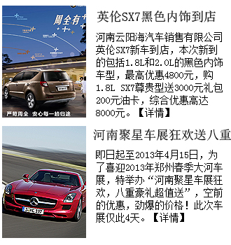 導(dǎo)語(yǔ)映象網(wǎng)汽車頻道,為了給廣大愛(ài)車人士提供更多的車市信息,創(chuàng)辦了車市行情欄目,欄目提供中原車市各大4S店的打折信息、活動(dòng)等信息,為您購(gòu)車、選車、試車做向?qū)А?/FONT>