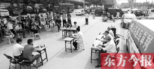 5月22日上午,鄭州市西四環(huán)須水立交橋旁,鄭州市中原區(qū)人民法院將法庭搬到這里,公開(kāi)開(kāi)庭審理了一起貨車(chē)肇事案,十幾名貨車(chē)司機(jī)坐在樹(shù)蔭下旁聽(tīng)。