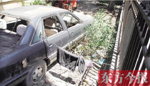 在采訪中得知,國棉三廠綠化街也有一輛“僵尸車”。東方今報記者在現(xiàn)場看到,這是一輛黑色馬自達轎車,經(jīng)過長時間的風吹雨打,油箱蓋、雨刮器、車頭銹跡斑斑,車頂凹陷,引擎蓋上放著一塊磚,同樣沒有車牌號。