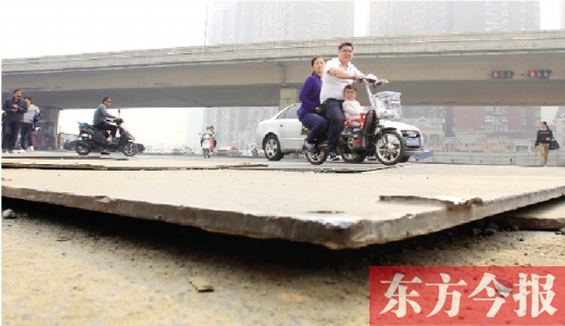 路人說(shuō):鐵板本來(lái)就比路面滑,再加上附近一直施工,經(jīng)常會(huì)有細(xì)土或砂石落在上面,就更加光滑,電動(dòng)車(chē)、自行車(chē)和行人走在上面,不小心的話(huà)很容易滑倒。如果再碰到鐵板的棱角,后果就不堪設(shè)想。