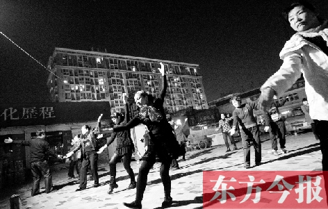 一塊百十平方米的小場地,距離居民樓不到10米。一盞探照燈,一個可滑動的大音響,伴隨著歌曲,三三兩兩的人就火熱開跳了。不遠處,陸續(xù)還有人來。甩開外套,加入隊伍中。