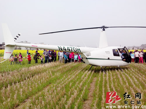 原標(biāo)題:游客駕直升機(jī)來(lái)安仁觀賞油菜花引圍觀(圖)