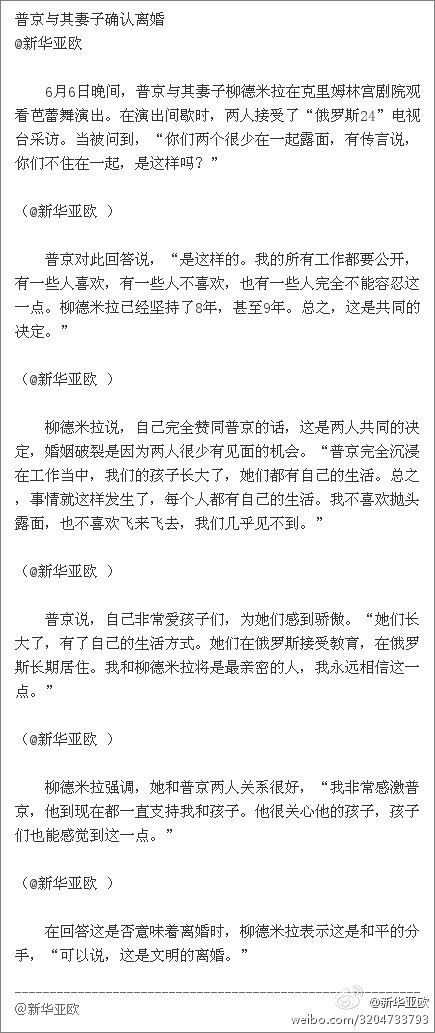 6月6日晚間,普京與其妻子柳德米拉在克里姆林宮劇院觀看芭蕾舞演出。在演出間歇時,兩人接受了“俄羅斯24”電視臺采訪。當(dāng)被問到,“你們兩個很少在一起露面,有傳言說,你們不住在一起,是這樣嗎?”普京與柳德米拉在回答問題時承認(rèn)兩人已離婚。