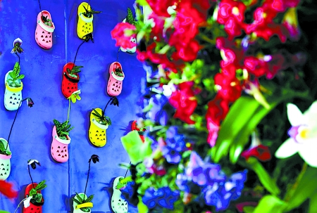 4月6日,“2012洛陽·中國名花展”在洛陽國家牡丹園開展,15天的展期將展出91類、200余種國內(nèi)珍奇名貴花卉。圖為展出的“仙履芳蹤”插花造型。 新華社發(fā)