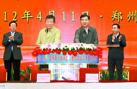 河南日?qǐng)?bào)訊 (記者平 萍 田宜龍 張建新)4月的中原大地,春暖花開,生機(jī)盎然。11日上午,2012廣東產(chǎn)品河南行啟動(dòng)暨粵豫經(jīng)貿(mào)合作項(xiàng)目簽約儀式在鄭州國際會(huì)展中心隆重舉行。率廣東省黨政代表團(tuán)來豫考察的中共中央政治局委員、廣東省委書記汪洋,省委書記、省人大常委會(huì)主任盧展工出席并共同啟動(dòng)廣東產(chǎn)品河南行活動(dòng)。廣東省委副書記、省長朱小丹,省委副書記、省長郭庚茂分別致辭。