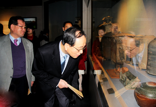 張文軍院長代表河南博物院對(duì)韓國文化交流團(tuán)表示歡迎,希望在今年中韓友好交流年之后還能經(jīng)常見到他們。趙南浩先生代表韓國人民由衷歡迎張文軍等中國朋友盡早訪問韓國。62歲的許由先生表示中韓兩國一衣帶水,文化一脈相承,祝愿中韓兩國的友誼萬古長青。最后他風(fēng)趣地說:爭取在66歲時(shí)訪華次數(shù)達(dá)到100次這個(gè)吉祥圓滿的數(shù)字。